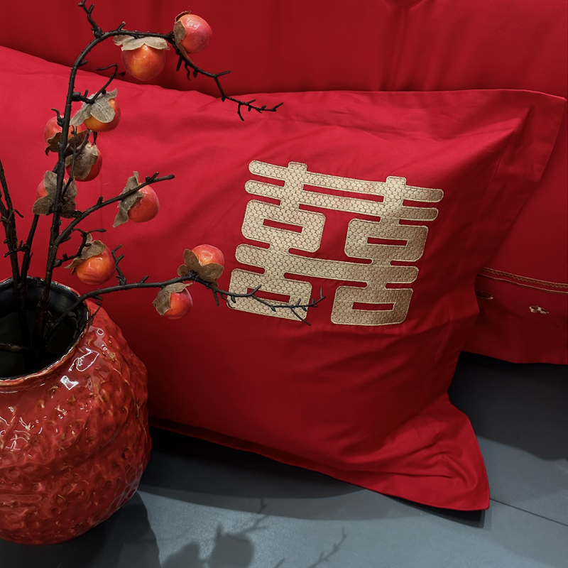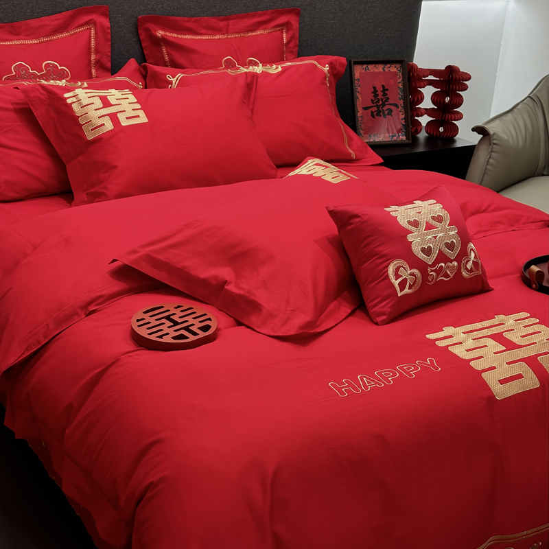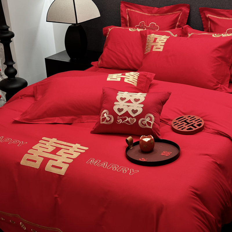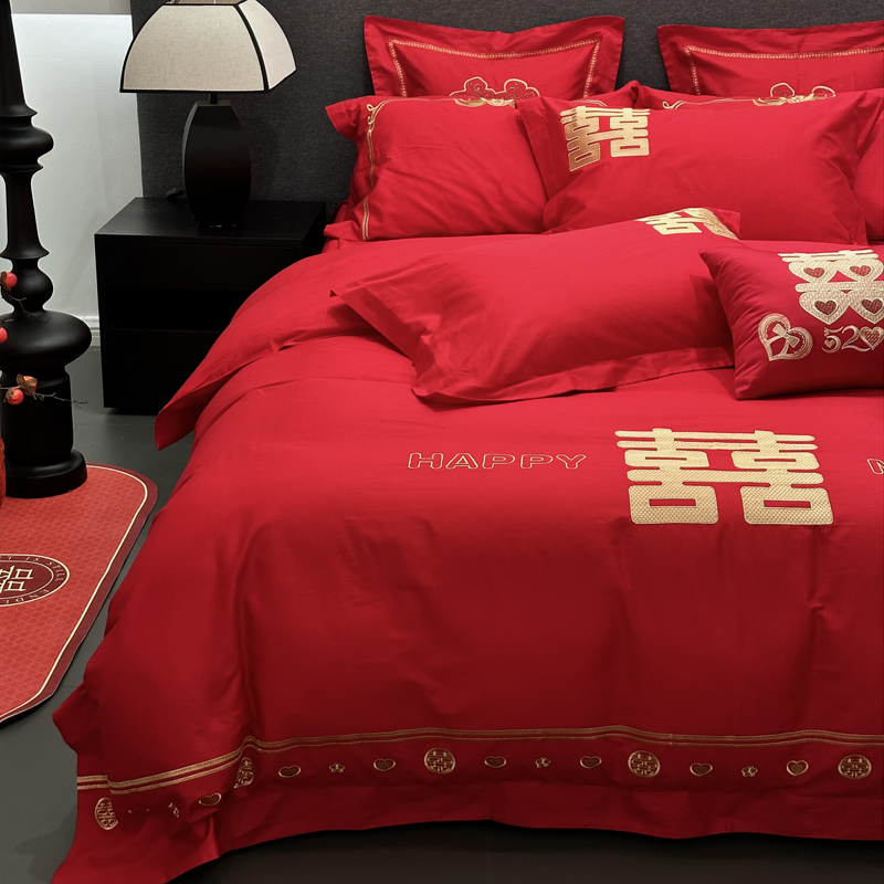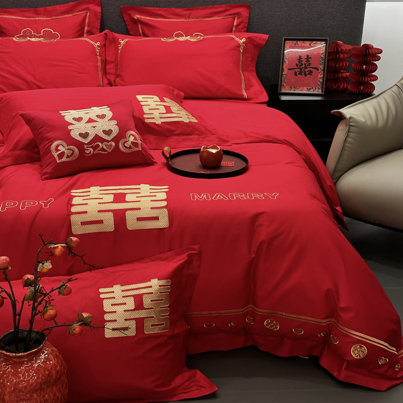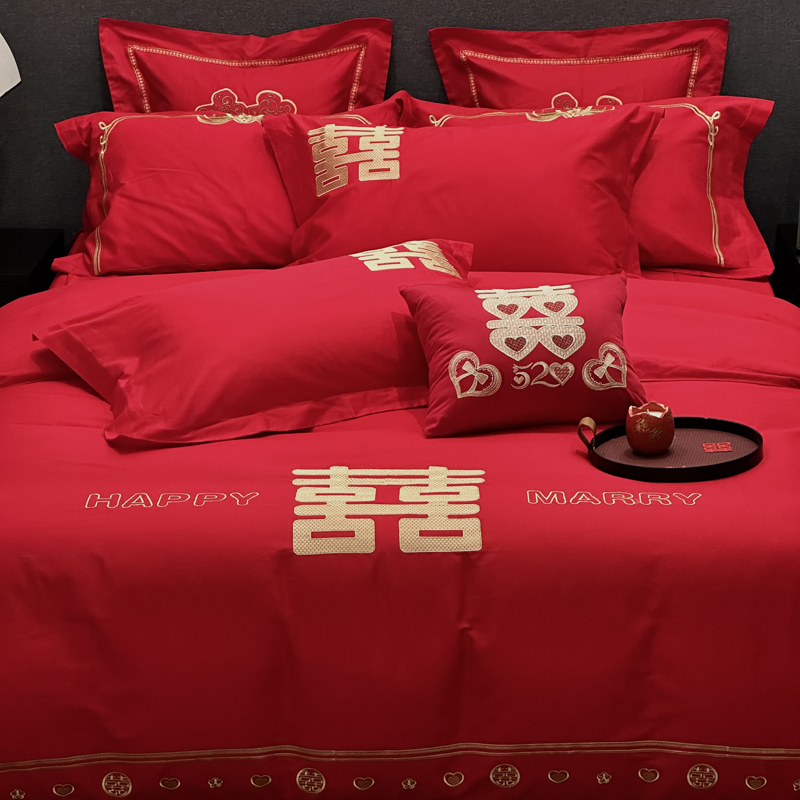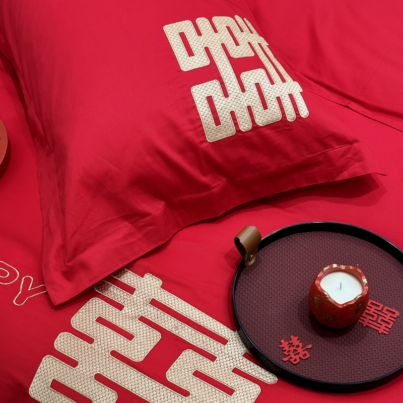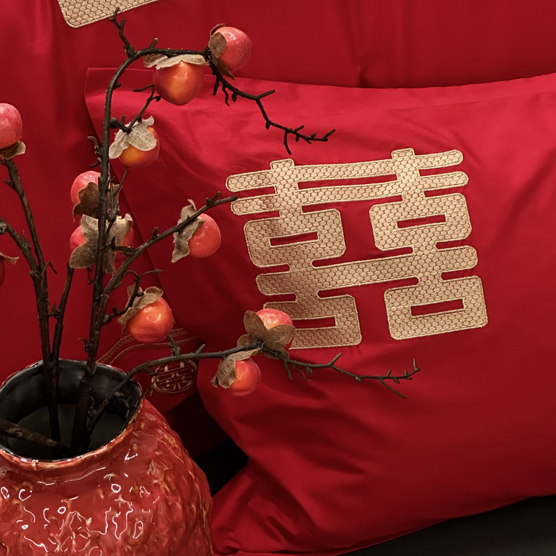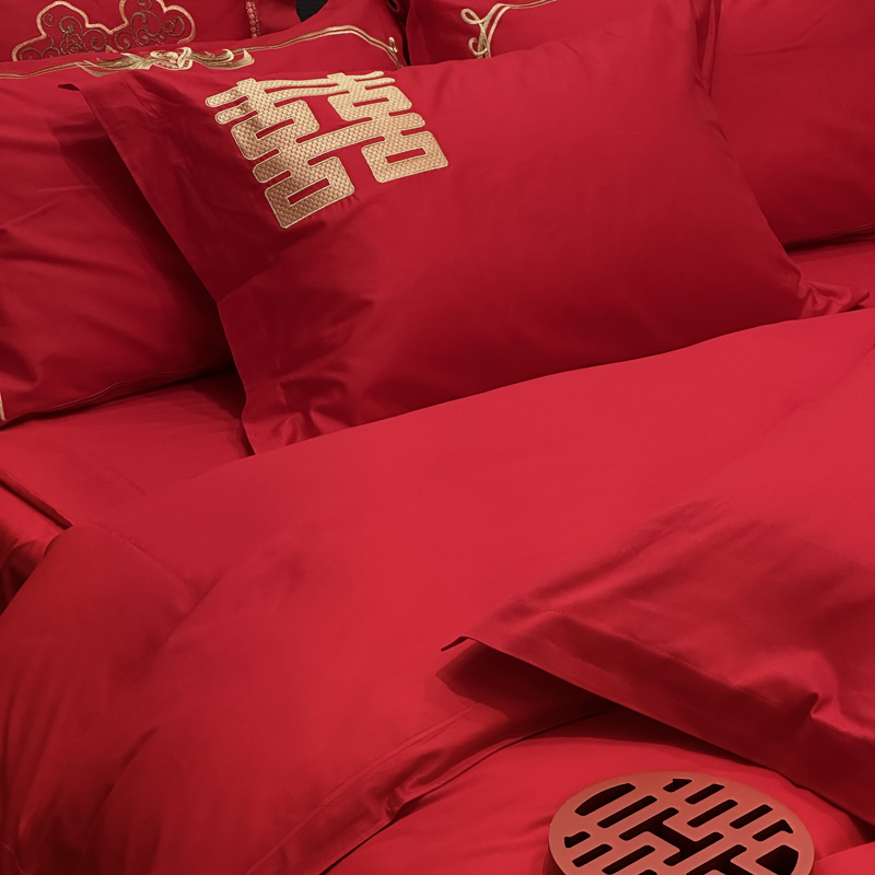 一针一线绣良辰,新中式国风婚床,盛启百年好合。以最炽热的中国红为底,承载千年婚禧的祝福。这套新中式婚庆床品套件,将传统吉祥图腾与现代审美意蕴完美交融,为您的洞房花烛夜铺陈一室雍容华贵与深情缱绻。中式刺绣风格,喜庆浪漫。幸福中国红,甜蜜浪漫,每一个细节都承载着设计师满满的祝福。宜言饮酒,与子偕老。琴瑟在御,莫不静好。