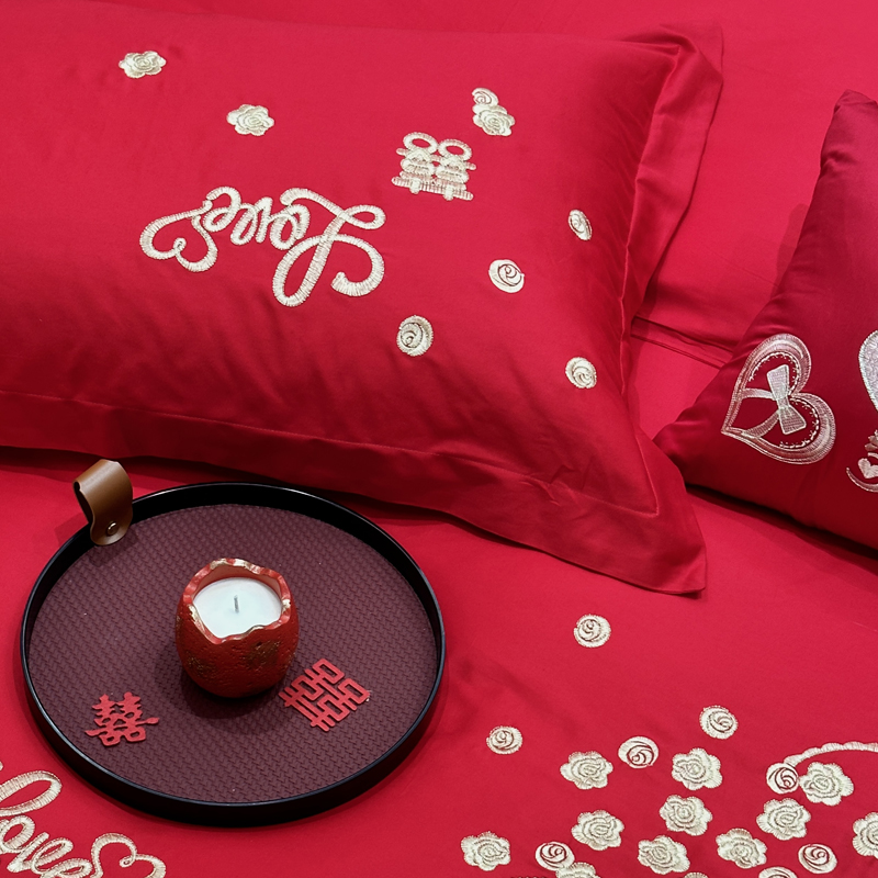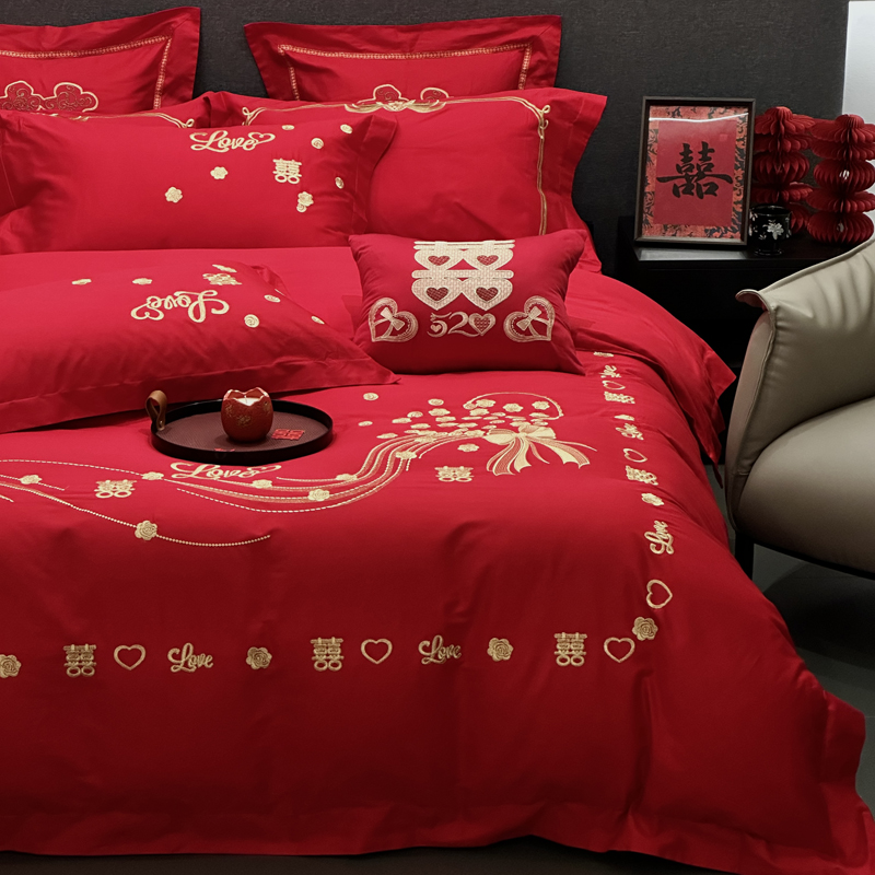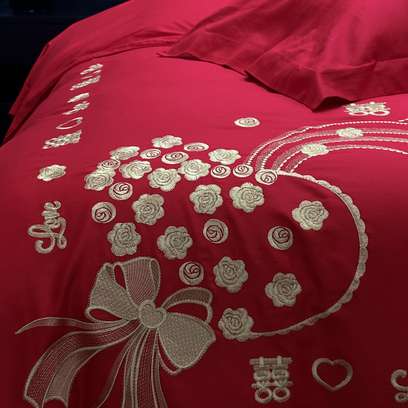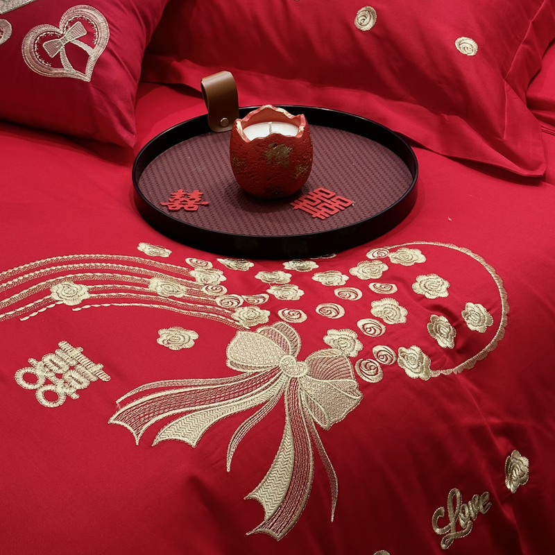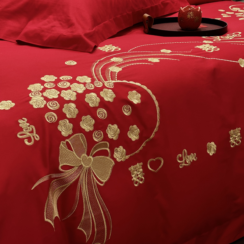 全棉大红刺绣婚庆套件-心心相依