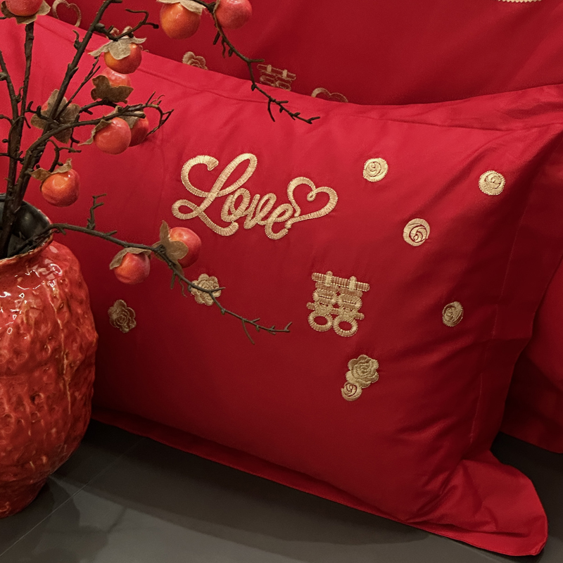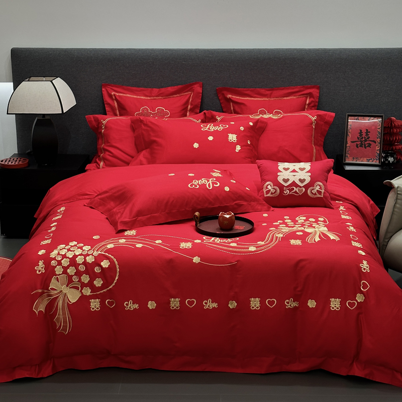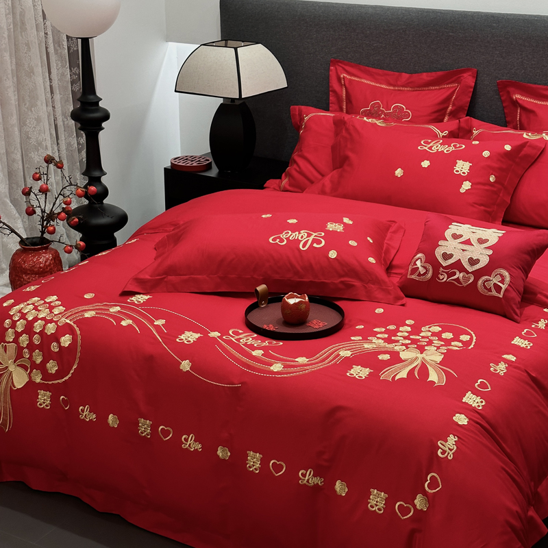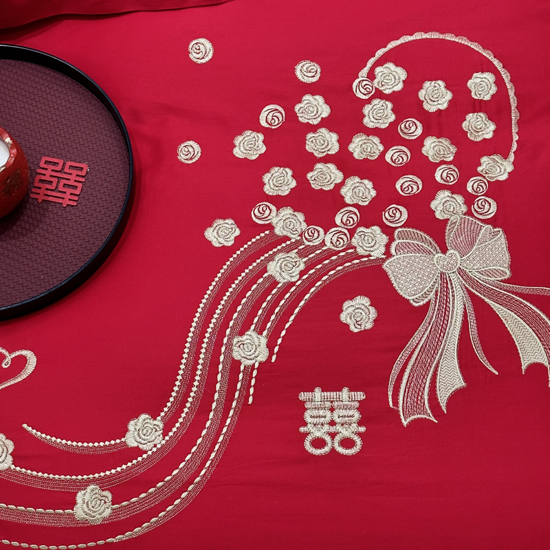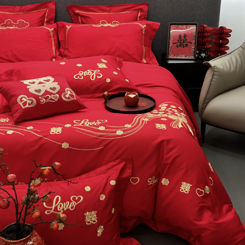 全棉大红刺绣婚庆套件-心心相依