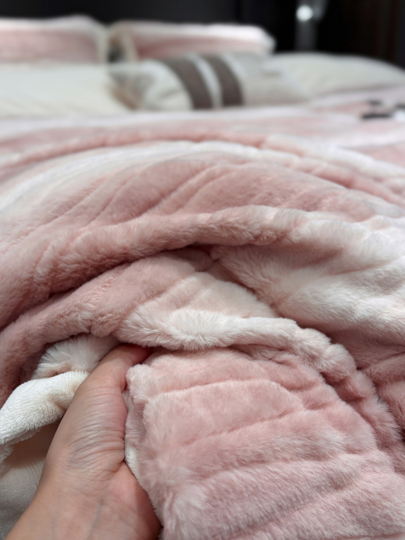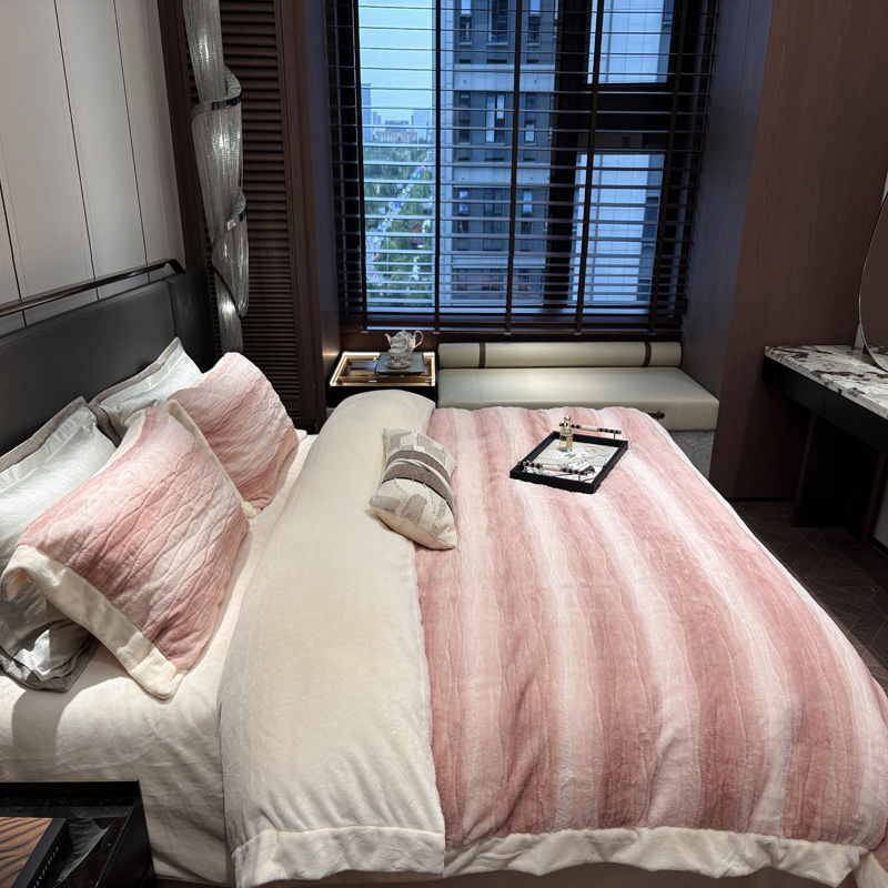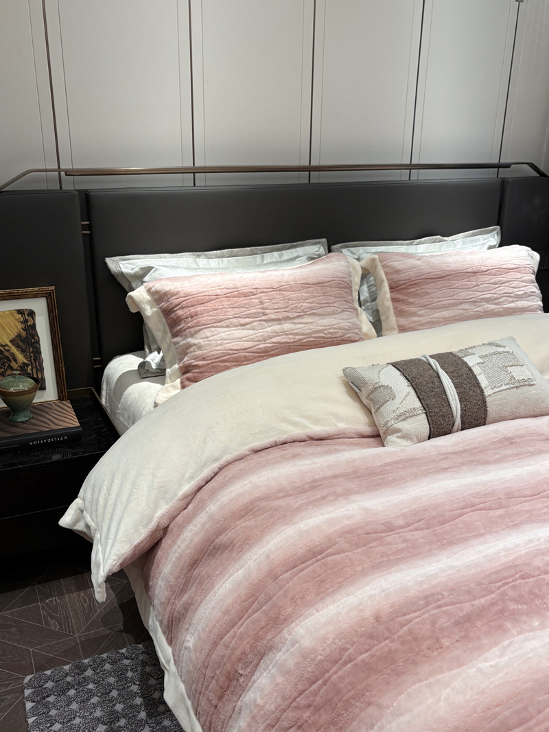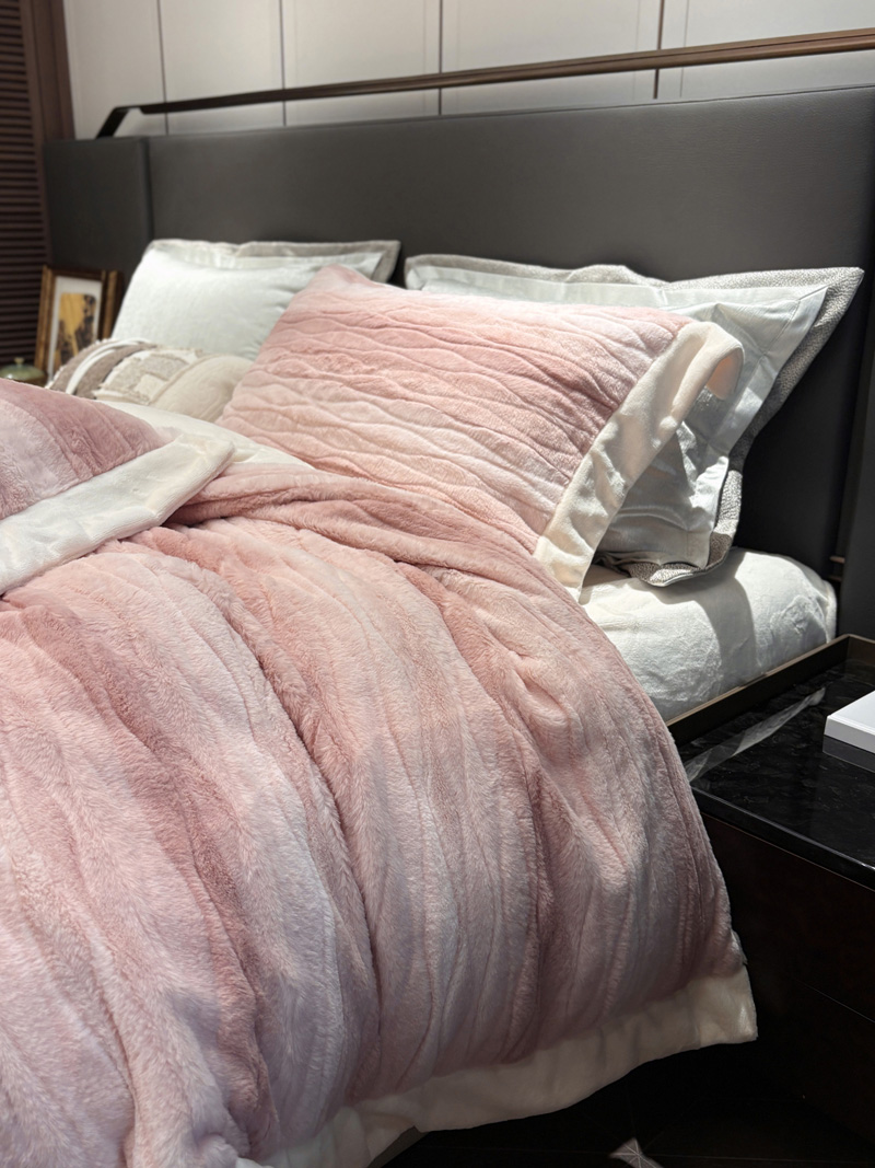 从此刻开始~柔和的绒感泛着温润光泽,摸上去软糯细腻,躺下时暖意顺着身体漫开,不用刻意装饰,卧室也成了自带轻奢氛围的暖居,整夜都像被柔软的奢华感托着,睡醒都舍不得掀开,把冬日的“温暖”与“贵气”都铺在床上。380克定制定染渐变色皮草绒,更显高品质,大宽边也奢华简约大气。看多了花里胡哨的设计,最终回归简约而不简单。