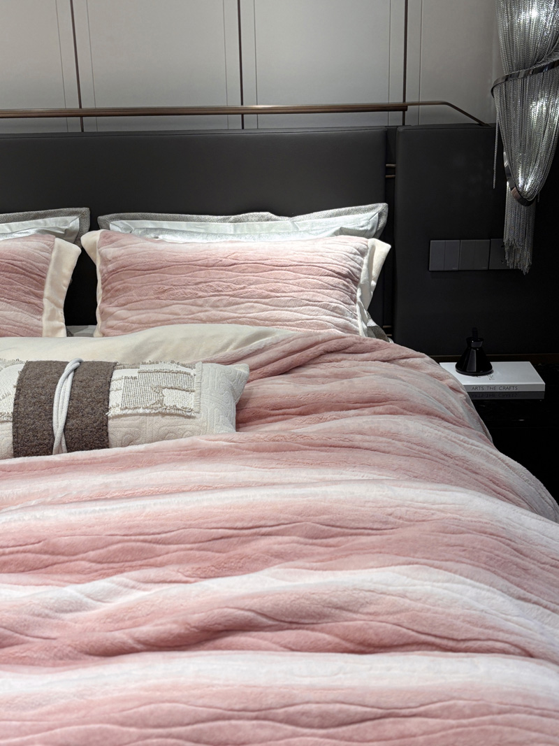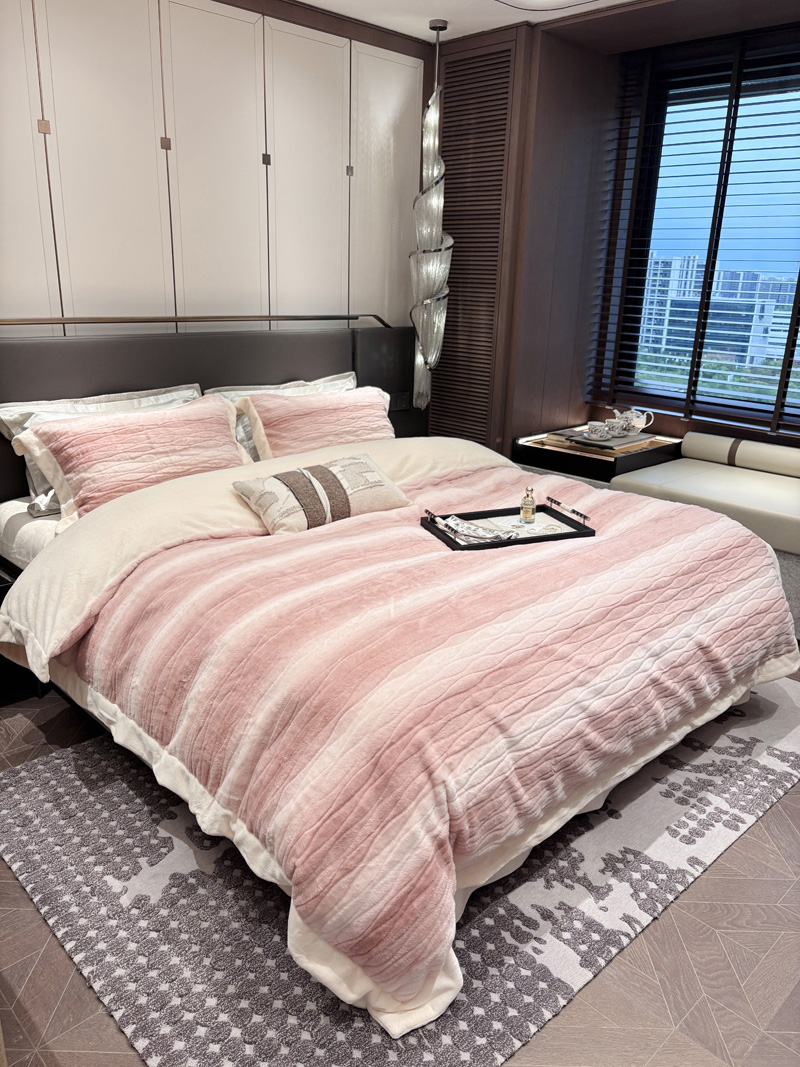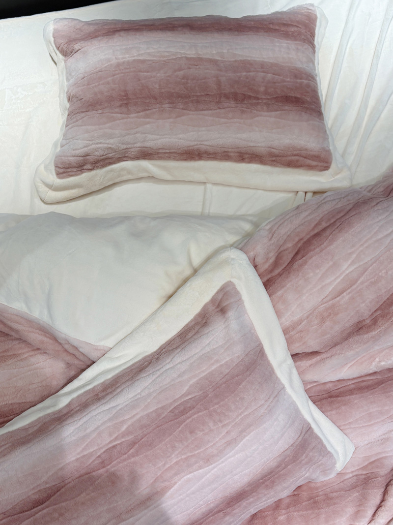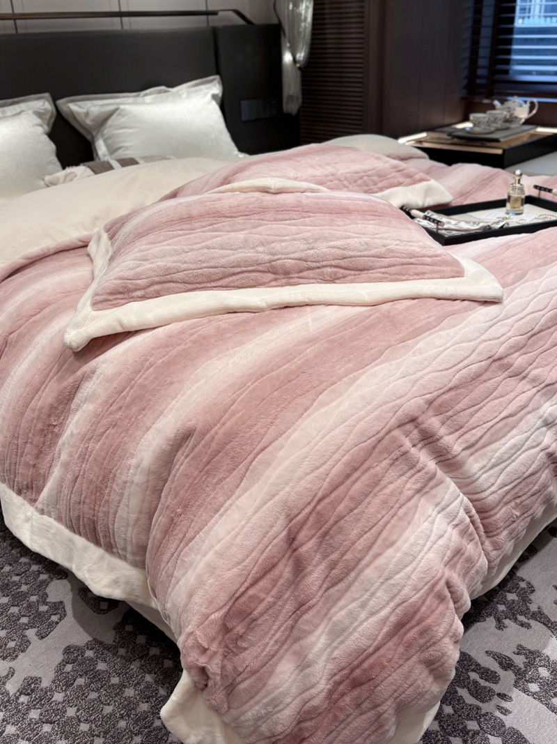 从此刻开始~柔和的绒感泛着温润光泽,摸上去软糯细腻,躺下时暖意顺着身体漫开,不用刻意装饰,卧室也成了自带轻奢氛围的暖居,整夜都像被柔软的奢华感托着,睡醒都舍不得掀开,把冬日的“温暖”与“贵气”都铺在床上。380克定制定染渐变色皮草绒,更显高品质,大宽边也奢华简约大气。看多了花里胡哨的设计,最终回归简约而不简单。