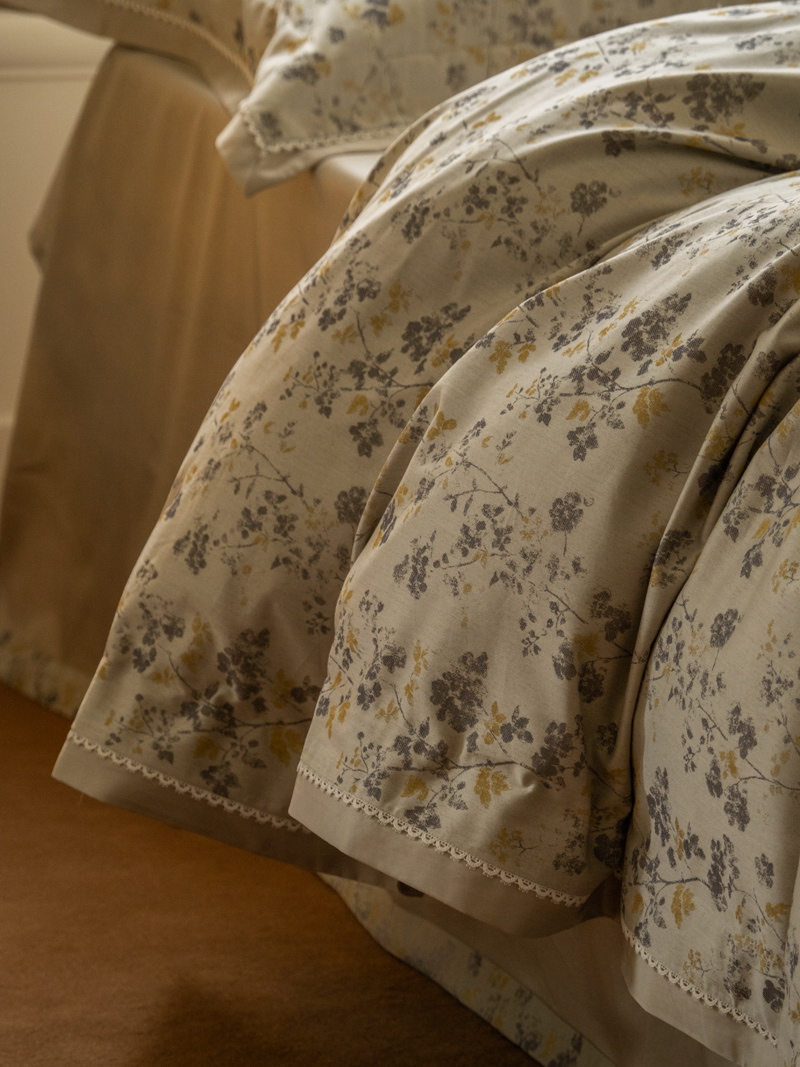 逅花园设计灵感:灵感来源于一处静谧的欧式古典花园,春风轻拂,鹅黄色小花于浅灰枝叶间自由绽放,勾勒出花枝交错、自然生长的浪漫意象。边缘饰以如雕花栏杆般的精致纹样,仿佛凝固了春日花园中灵动的一隅。整体弥漫着清新而高雅的生机氛围,细腻的纹理与柔和的色彩彼此呼应,为居室空间注入一丝不经意间的奢华与自然诗意。