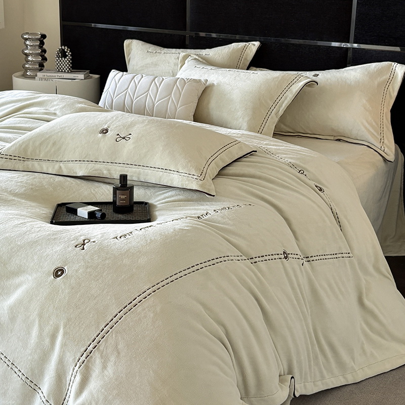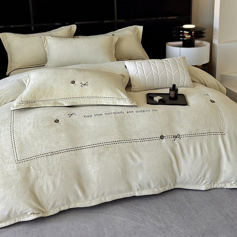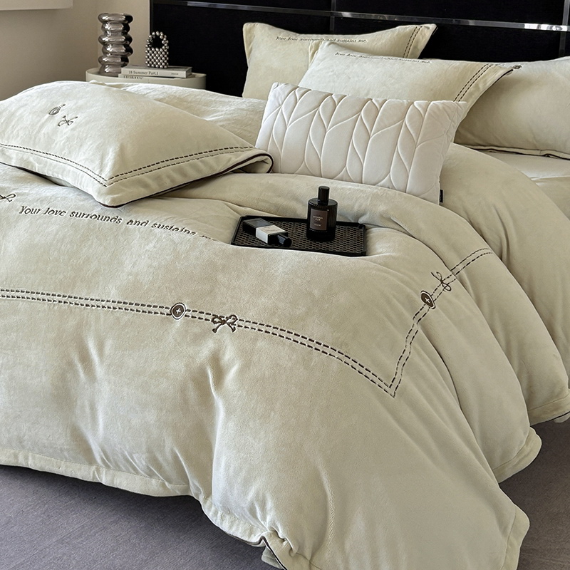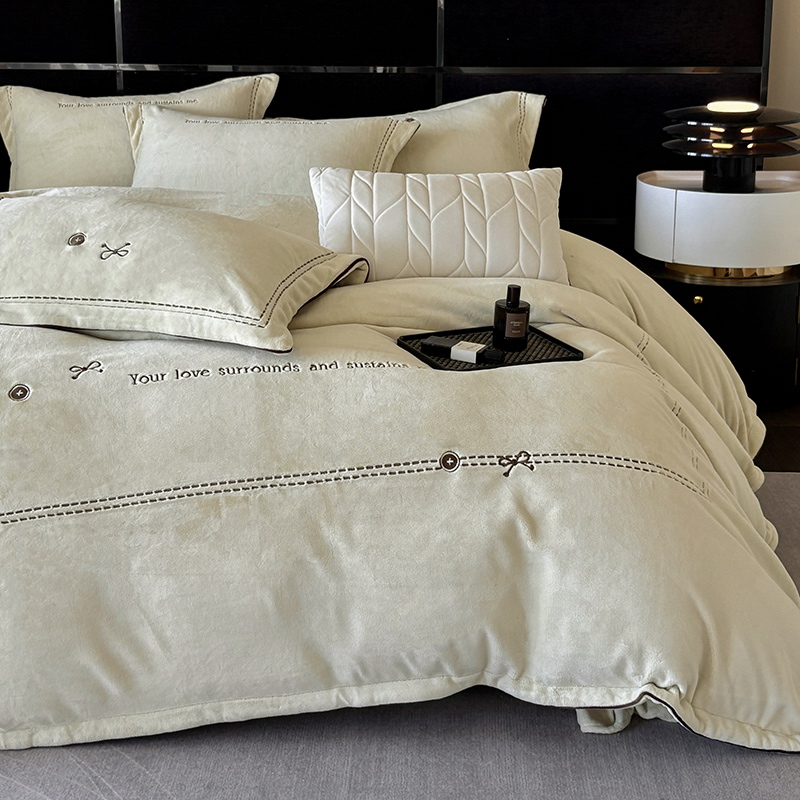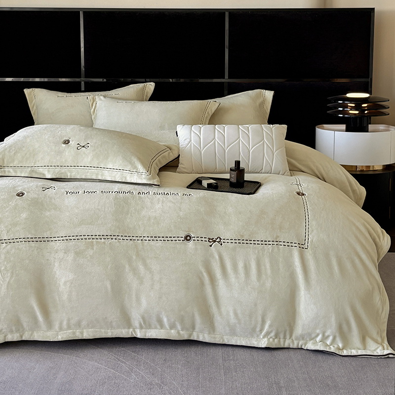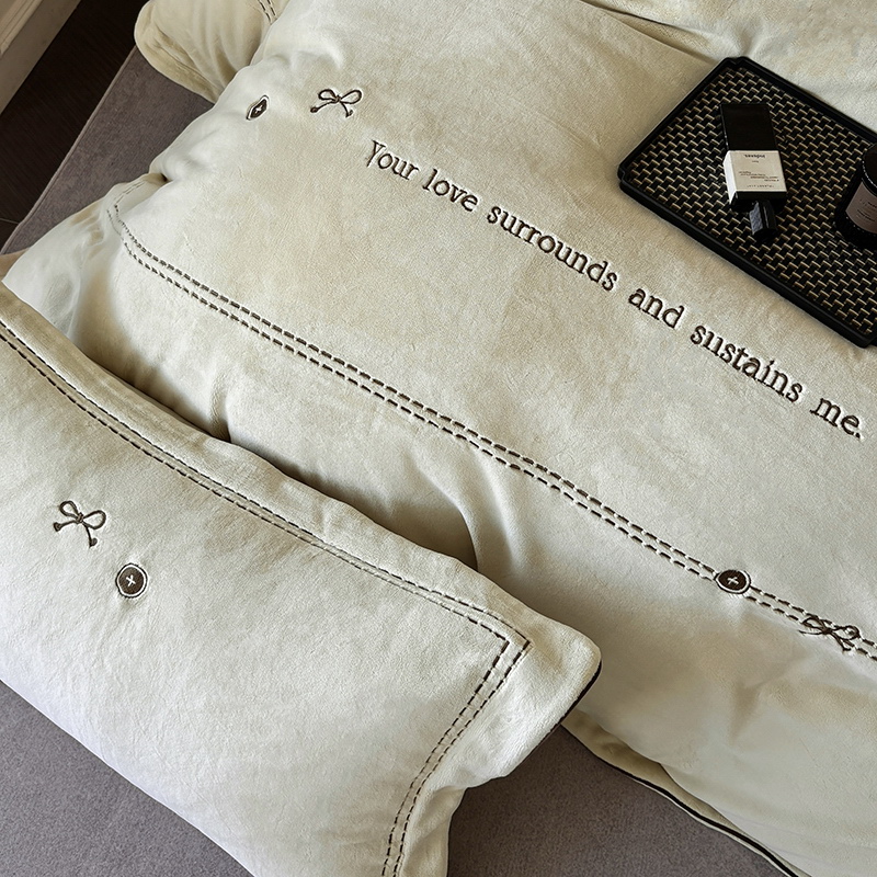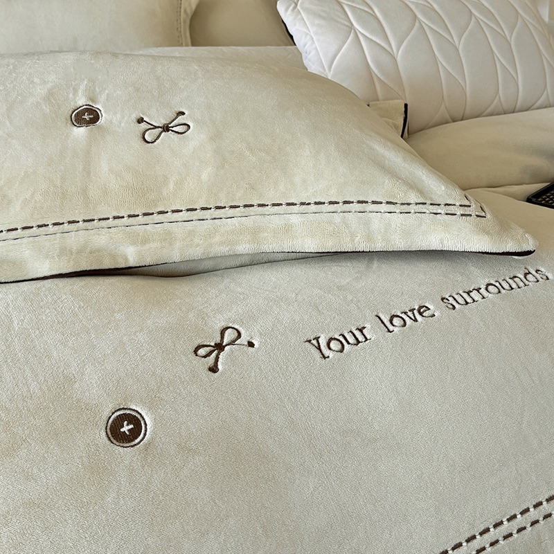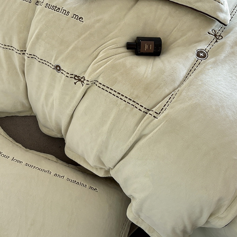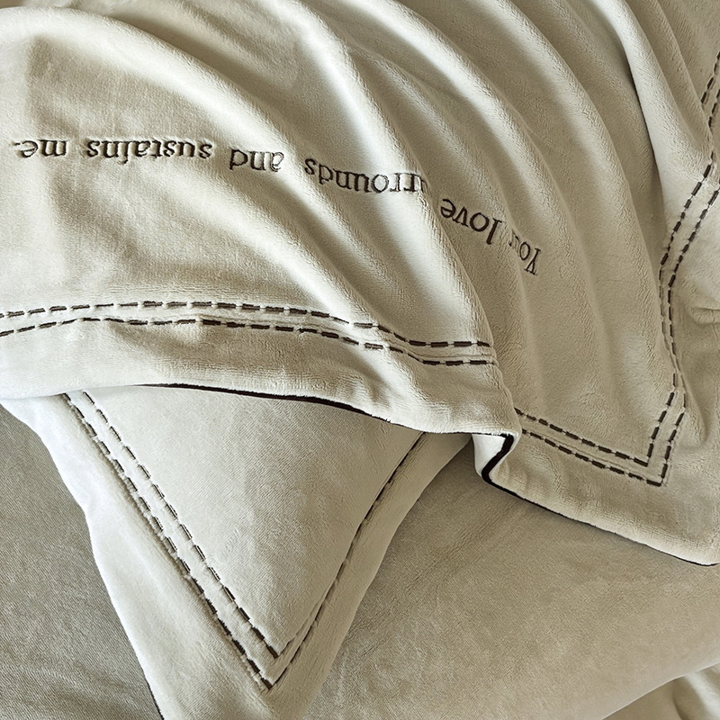 奢华秘鲁进口骆玛绒面料,再次升级研发,注重低调精致的生活方式,臻选温暖的自然原材成为设计的核心。在复古风格流行趋势中,聚焦于暖性色调的魅力展现,如棕、粉、绿等色调,营造温暖浪漫,冷杉绿增点清新雅致,平衡热烈氛围。局部高定品牌字母设计,巧妙地将经典刺绣工艺与现代审美相结合,创造出一种独特而引人注目的视觉效果,为简约的床品增添了一抹生动与活力。