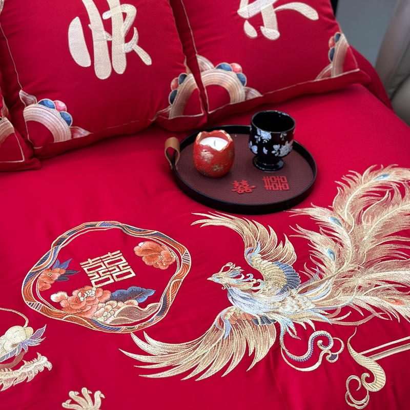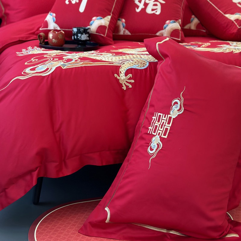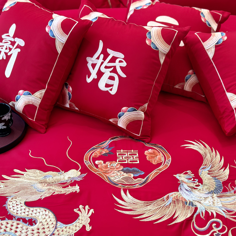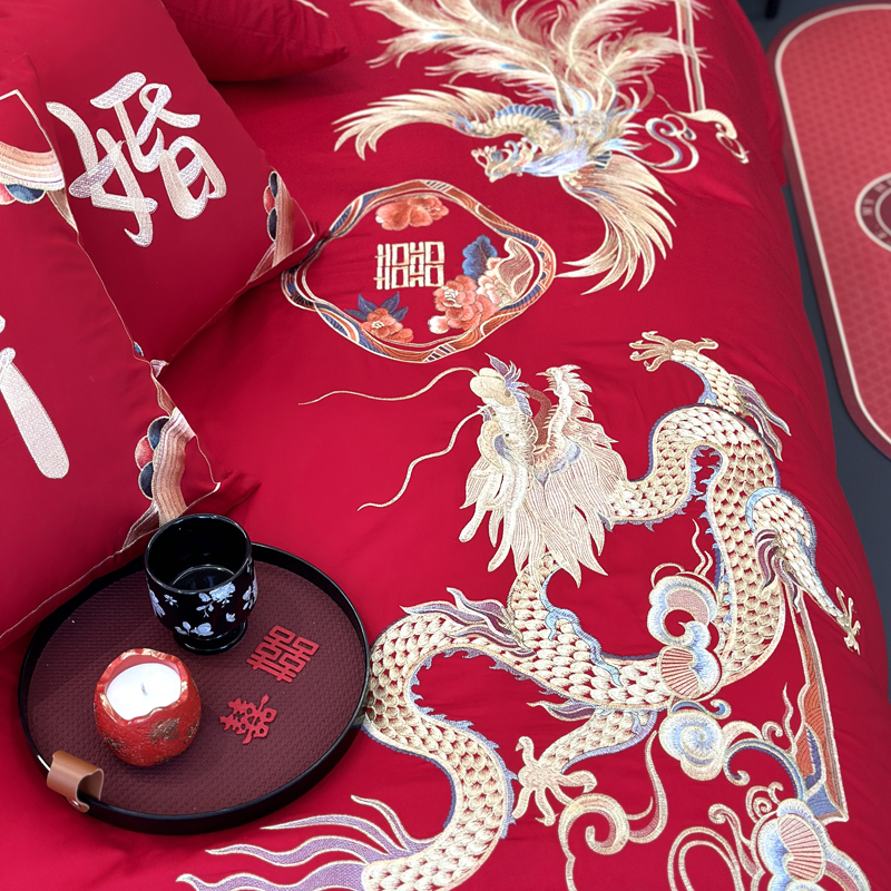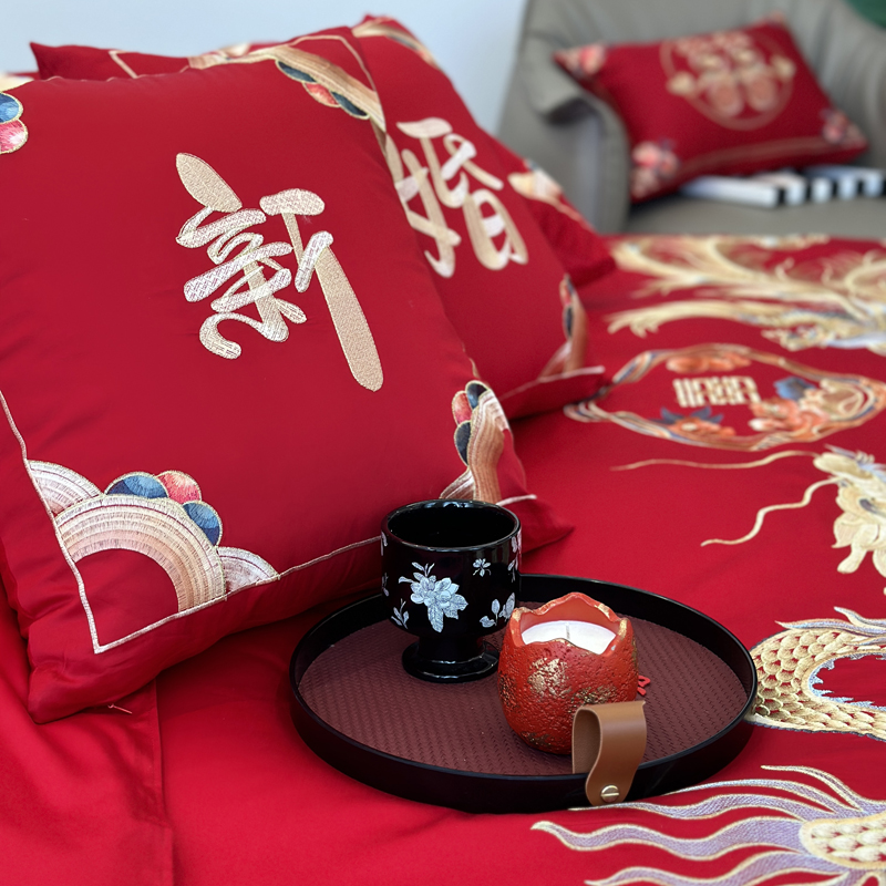 轻奢雅致婚嫁系列以柔软织物载入千年吉意将东方喜礼与现代品味轻柔交融献给彼此许诺一生的两个人。「天工开物 礼序东方」溯自周制婚仪六礼,延至盛唐红烛华帐,华夏婚典以五色为盟、纹样为誓,将山河岁月织就成永不褪色的誓言。此四件套承《礼记·昏义》之魂,融明清御用织造之技,以经纬为笔,以丝线为墨,重书千年婚俗长卷。我们已将五千年婚俗密码织进每一根棉纤维从合卺酒到结发礼,从却扇诗到铺床歌让洞房花烛夜的古老仪式,在21世纪的月光下绽放出比故宫红墙更永恒的东方之美。