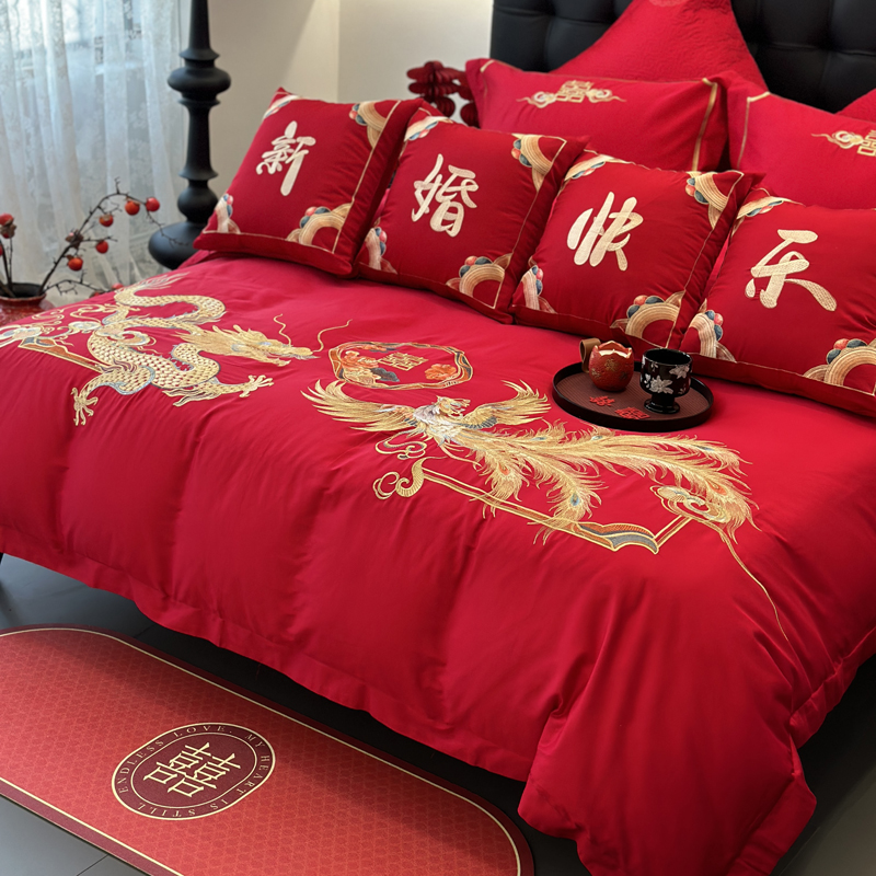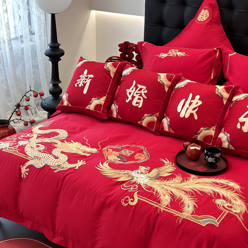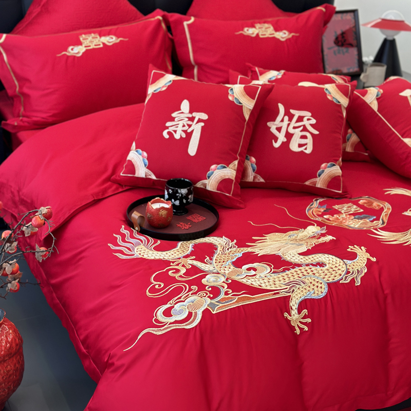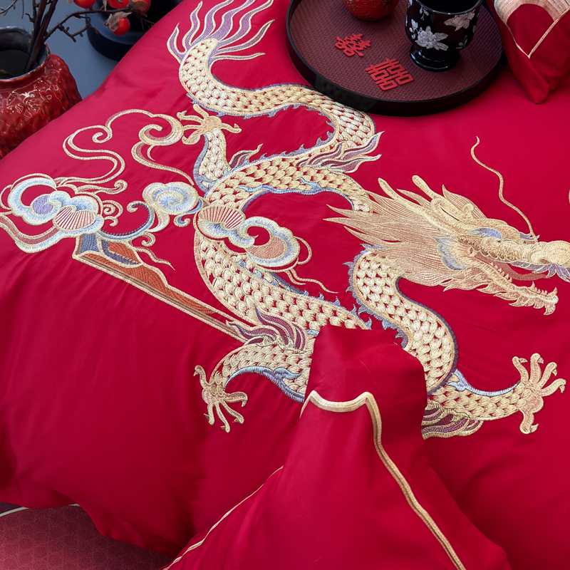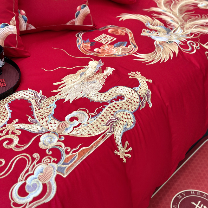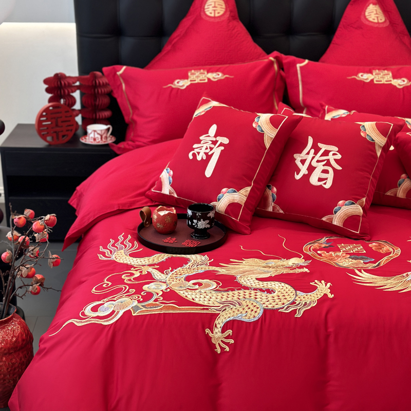 轻奢雅致婚嫁系列以柔软织物载入千年吉意将东方喜礼与现代品味轻柔交融献给彼此许诺一生的两个人。「天工开物 礼序东方」溯自周制婚仪六礼,延至盛唐红烛华帐,华夏婚典以五色为盟、纹样为誓,将山河岁月织就成永不褪色的誓言。此四件套承《礼记·昏义》之魂,融明清御用织造之技,以经纬为笔,以丝线为墨,重书千年婚俗长卷。我们已将五千年婚俗密码织进每一根棉纤维从合卺酒到结发礼,从却扇诗到铺床歌让洞房花烛夜的古老仪式,在21世纪的月光下绽放出比故宫红墙更永恒的东方之美。