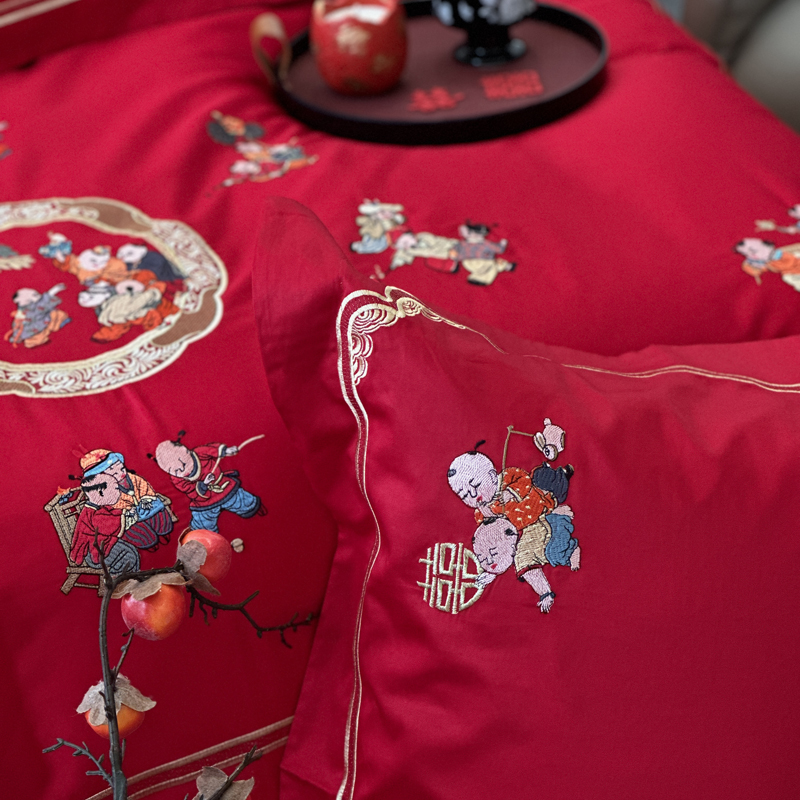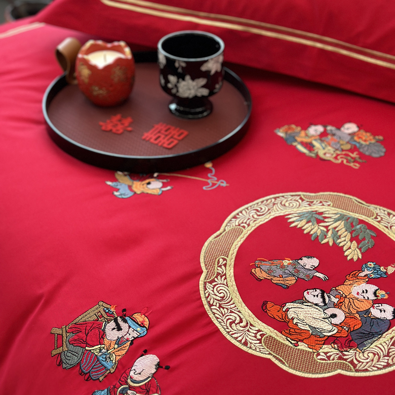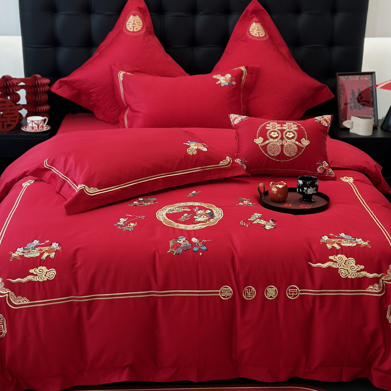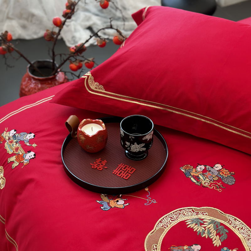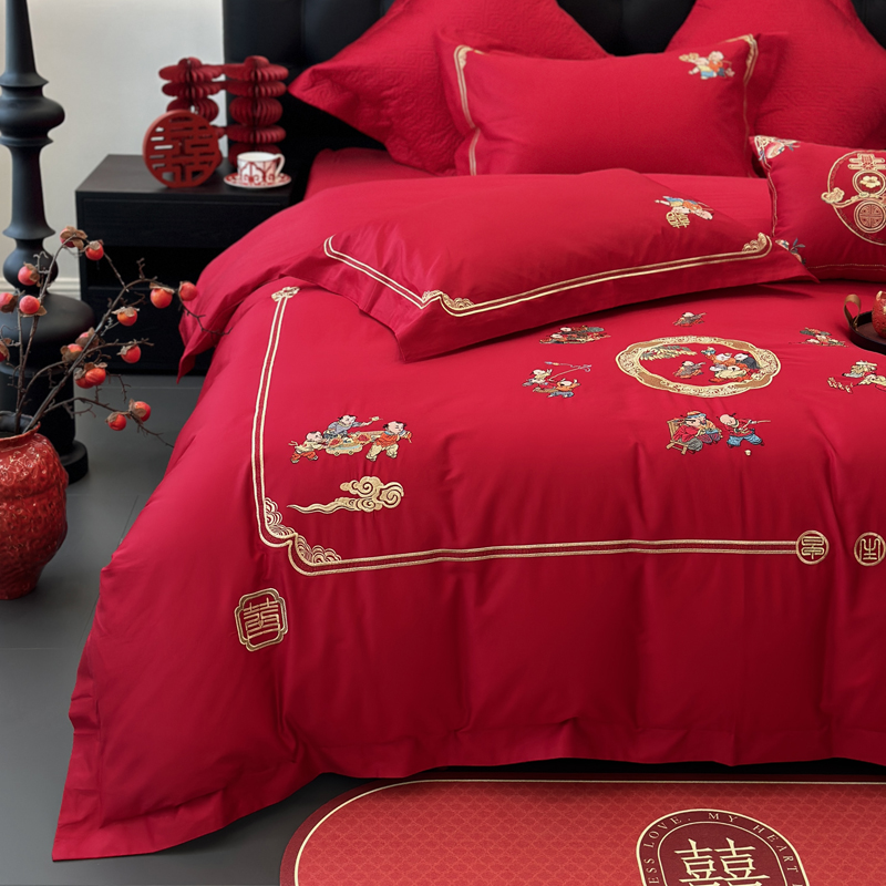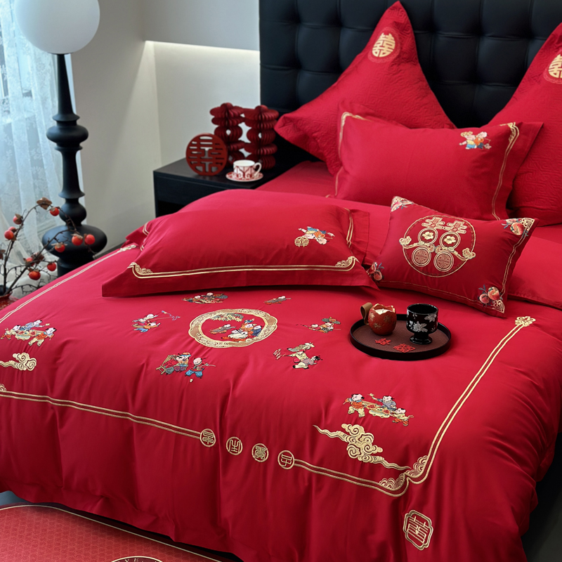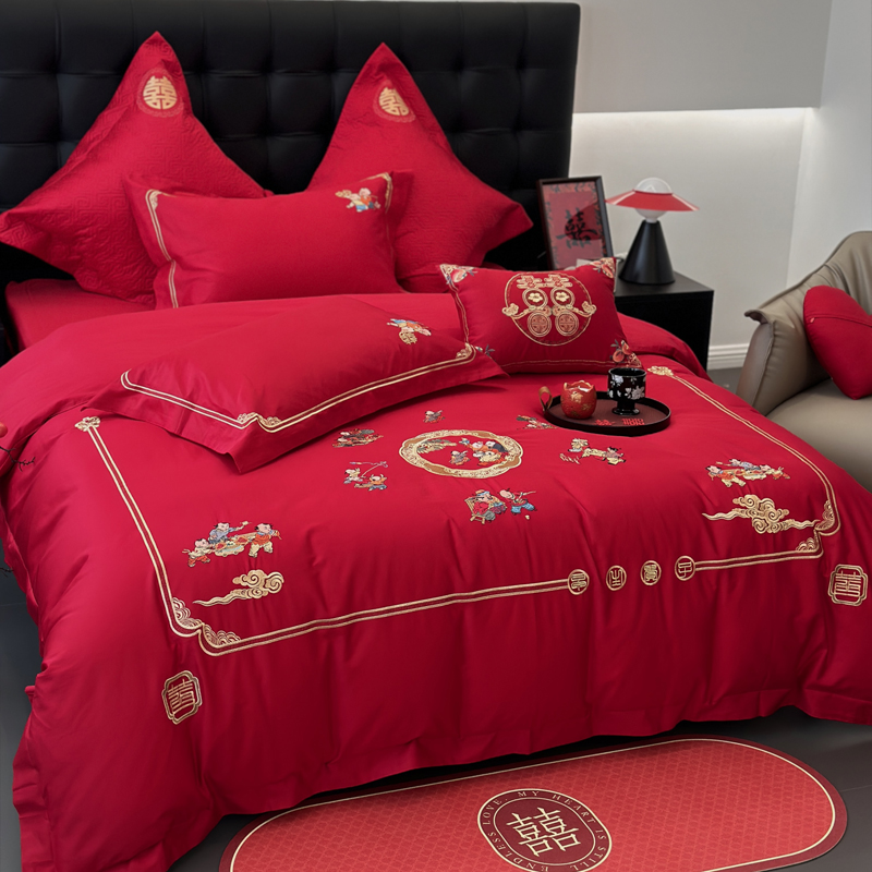 轻奢雅致婚嫁系列以柔软织物载入千年吉意将东方喜礼与现代品味轻柔交融献给彼此许诺一生的两个人。「天工开物 礼序东方」溯自周制婚仪六礼,延至盛唐红烛华帐,华夏婚典以五色为盟、纹样为誓,将山河岁月织就成永不褪色的誓言。此四件套承《礼记·昏义》之魂,融明清御用织造之技,以经纬为笔,以丝线为墨,重书千年婚俗长卷。我们已将五千年婚俗密码织进每一根棉纤维从合卺酒到结发礼,从却扇诗到铺床歌让洞房花烛夜的古老仪式,在21世纪的月光下绽放出比故宫红墙更永恒的东方之美。