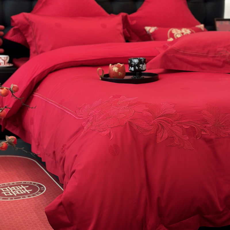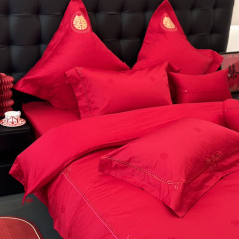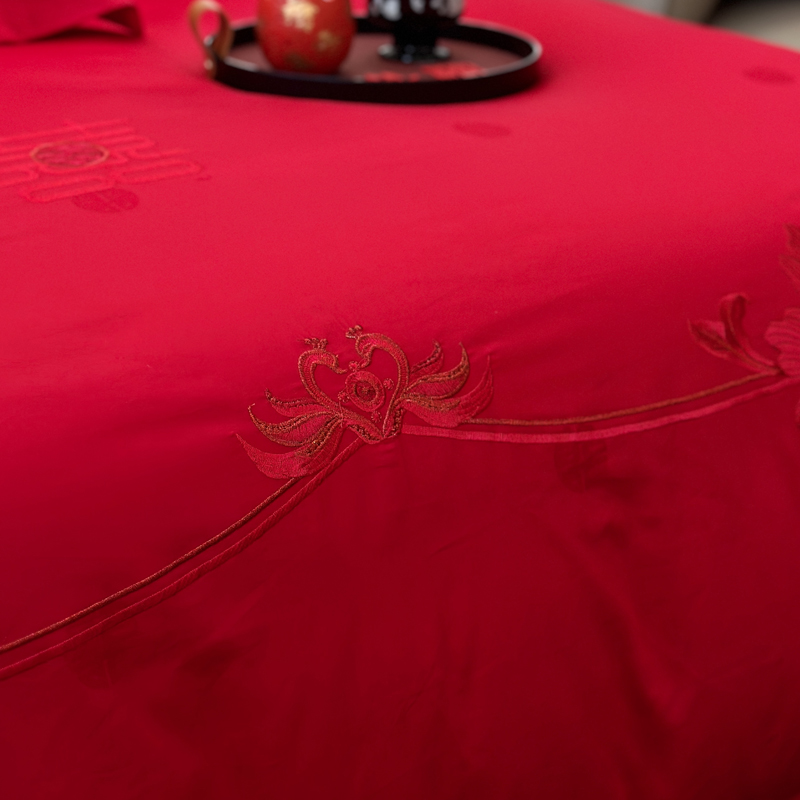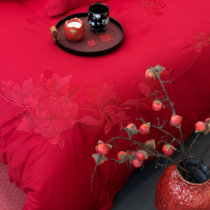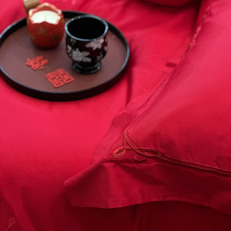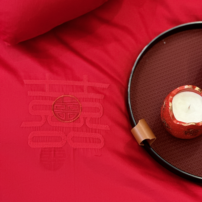 轻奢雅致婚嫁系列以柔软织物载入千年吉意将东方喜礼与现代品味轻柔交融献给彼此许诺一生的两个人。「天工开物 礼序东方」溯自周制婚仪六礼,延至盛唐红烛华帐,华夏婚典以五色为盟、纹样为誓,将山河岁月织就成永不褪色的誓言。此四件套承《礼记·昏义》之魂,融明清御用织造之技,以经纬为笔,以丝线为墨,重书千年婚俗长卷。我们已将五千年婚俗密码织进每一根棉纤维从合卺酒到结发礼,从却扇诗到铺床歌让洞房花烛夜的古老仪式,在21世纪的月光下绽放出比故宫红墙更永恒的东方之美。
