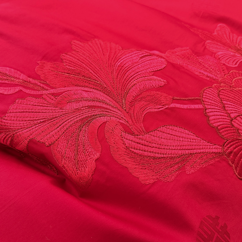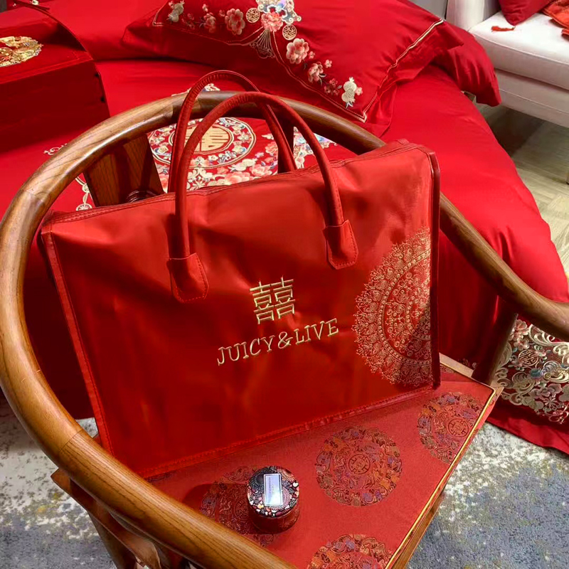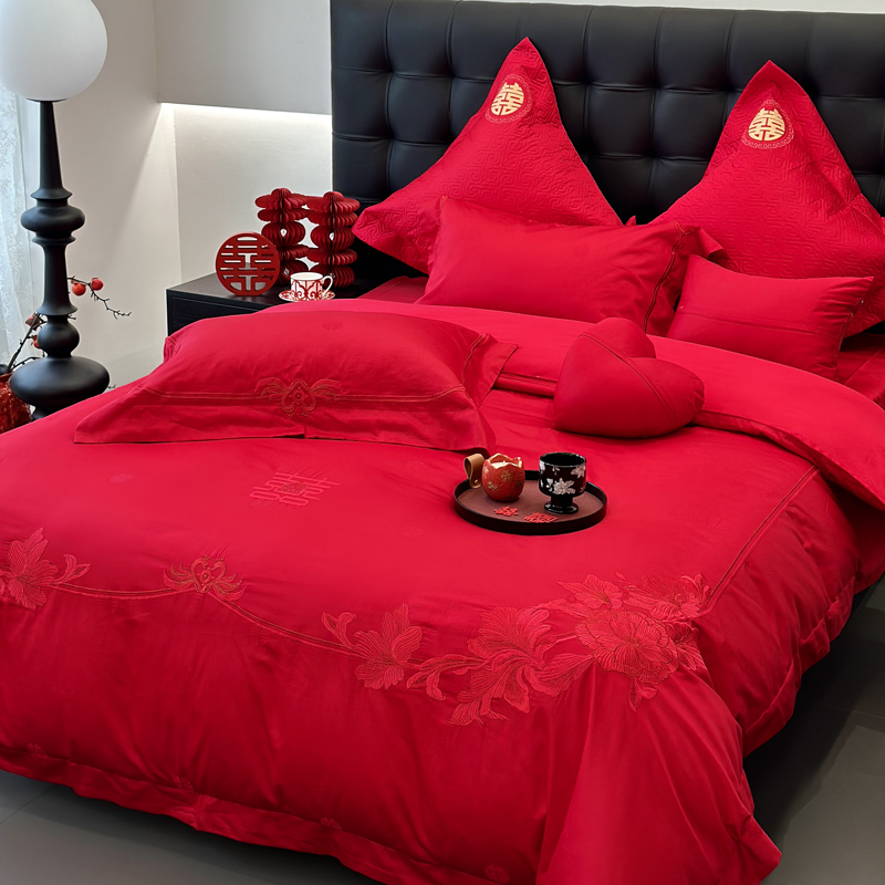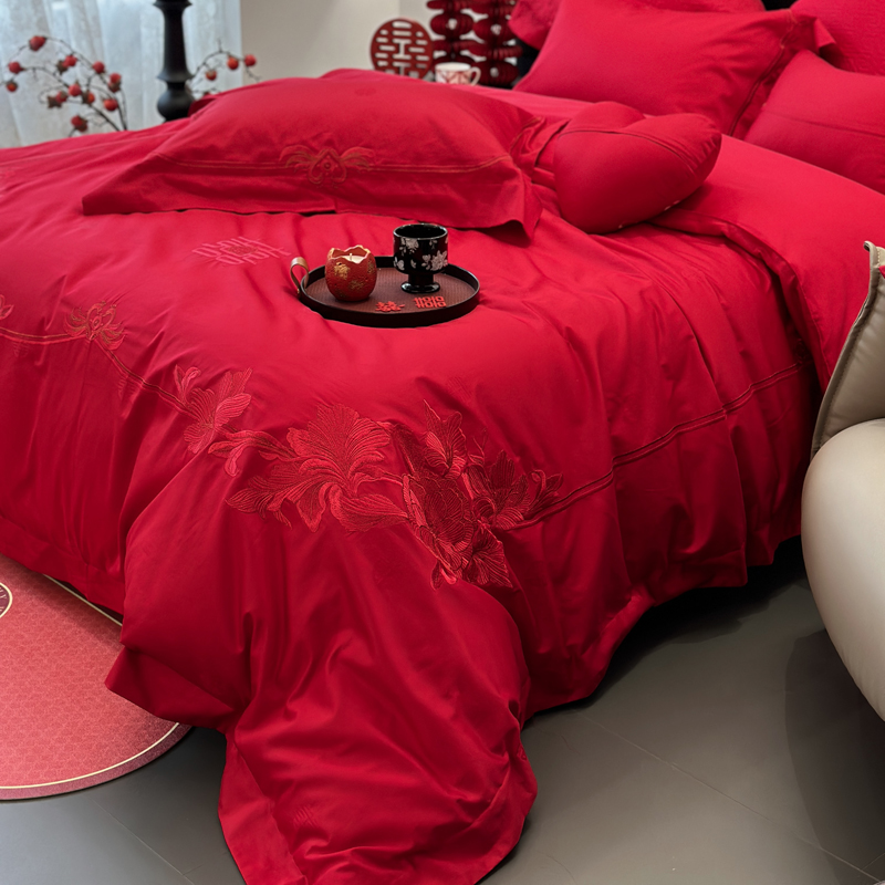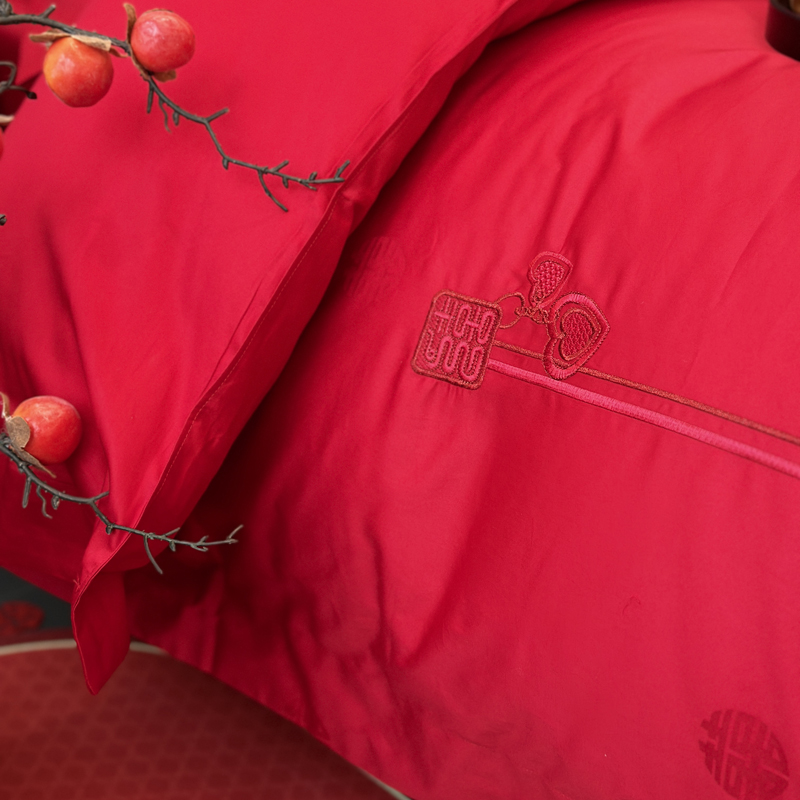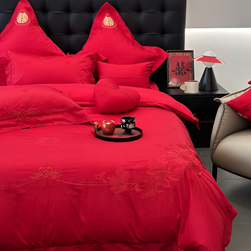 轻奢雅致婚嫁系列以柔软织物载入千年吉意将东方喜礼与现代品味轻柔交融献给彼此许诺一生的两个人。「天工开物 礼序东方」溯自周制婚仪六礼,延至盛唐红烛华帐,华夏婚典以五色为盟、纹样为誓,将山河岁月织就成永不褪色的誓言。此四件套承《礼记·昏义》之魂,融明清御用织造之技,以经纬为笔,以丝线为墨,重书千年婚俗长卷。我们已将五千年婚俗密码织进每一根棉纤维从合卺酒到结发礼,从却扇诗到铺床歌让洞房花烛夜的古老仪式,在21世纪的月光下绽放出比故宫红墙更永恒的东方之美。