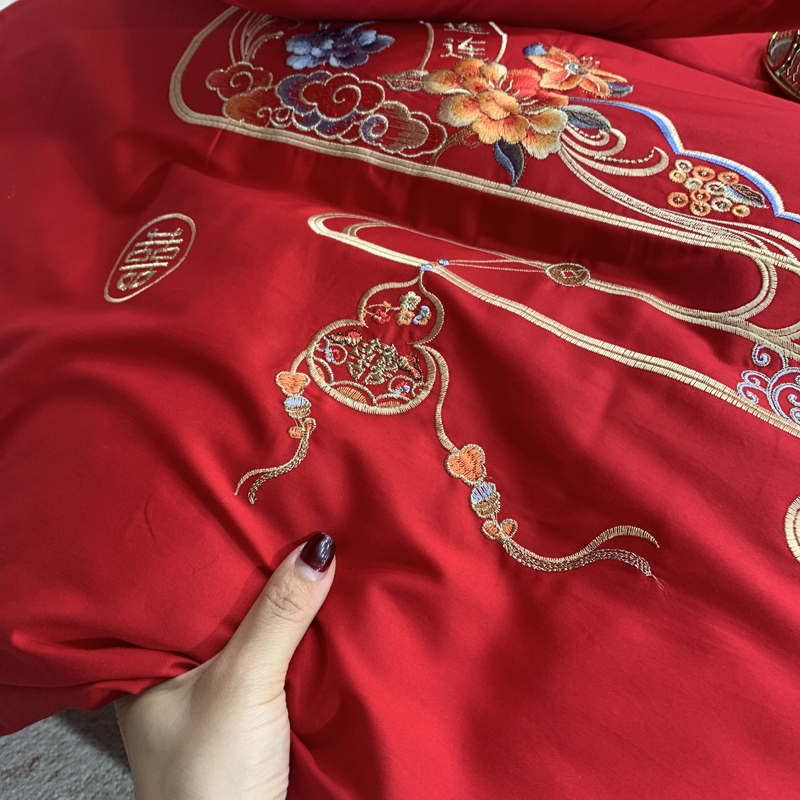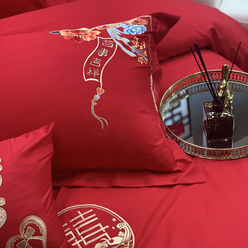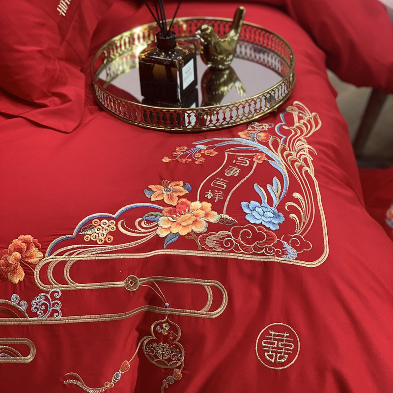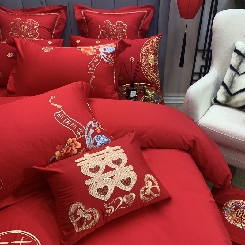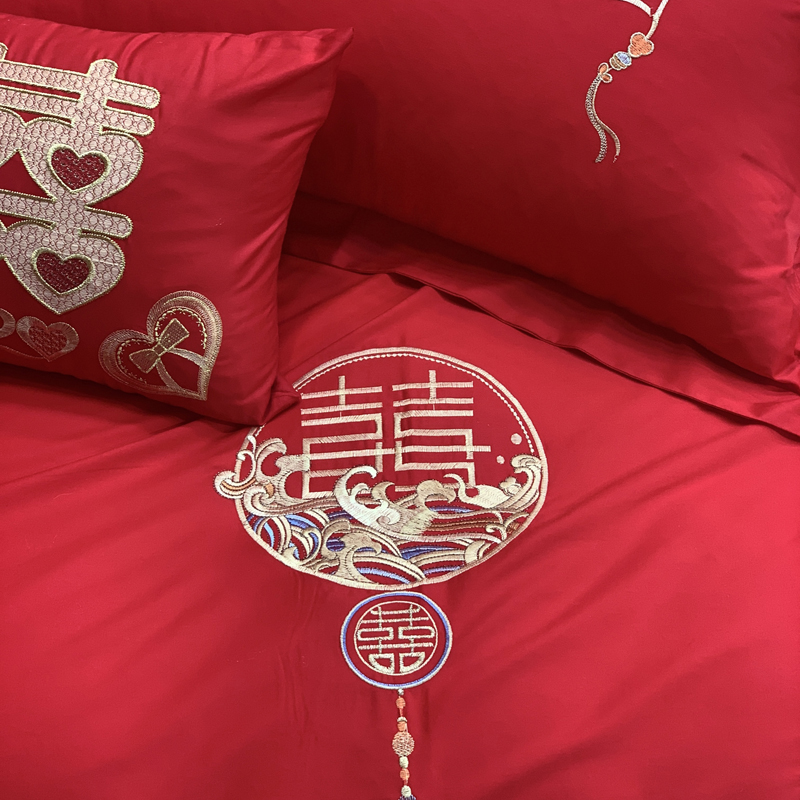 一针一线绣良辰,新中式国风婚床,盛启百年好合。以最炽热的中国红为底,承载千年婚禧的祝福。这套新中式婚庆床品套件,将传统吉祥图腾与现代审美意蕴完美交融,为您的洞房花烛夜铺陈一室雍容华贵与深情缱绻。中式刺绣风格,喜庆浪漫。幸福中国红,甜蜜浪漫,每一个细节都承载着设计师满满的祝福。宜言饮酒,与子偕老。琴瑟在御,莫不静好。