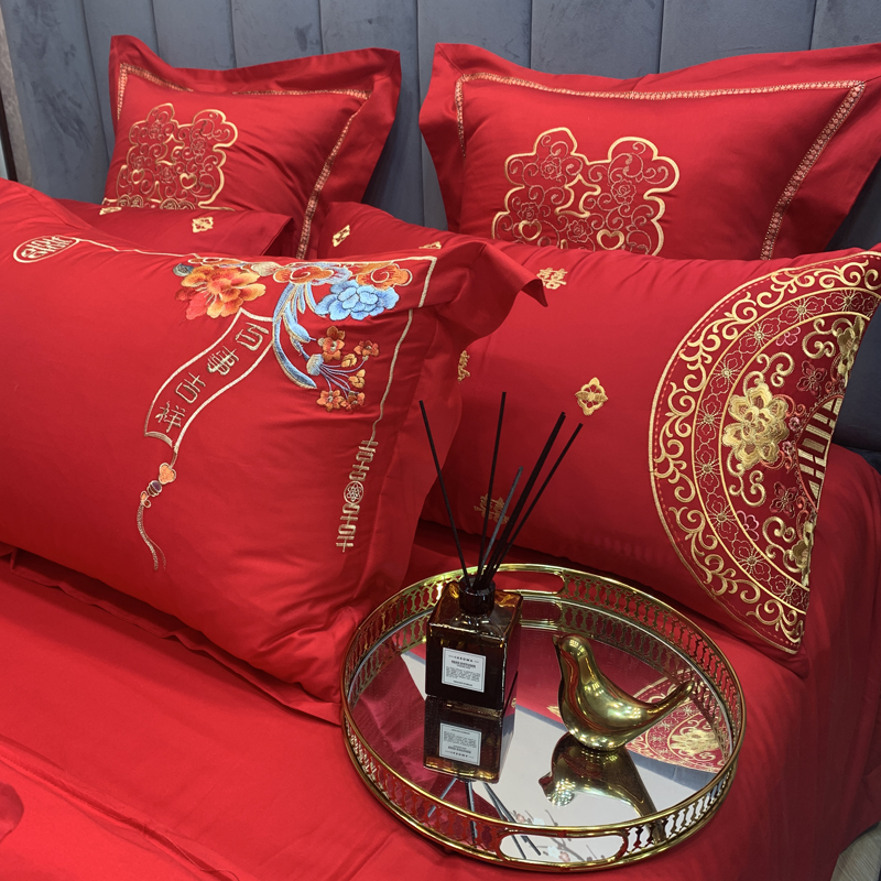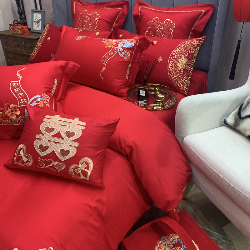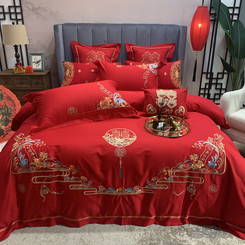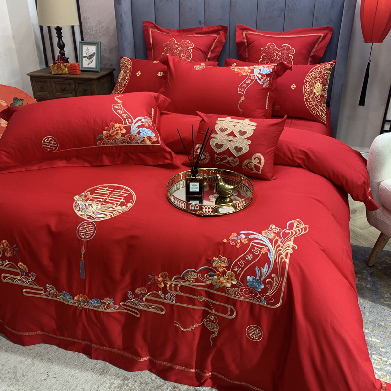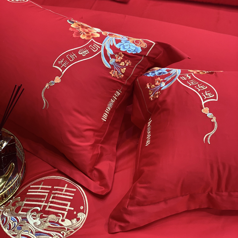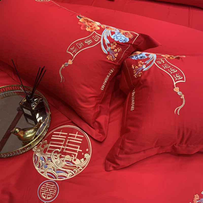 一针一线绣良辰,新中式国风婚床,盛启百年好合。以最炽热的中国红为底,承载千年婚禧的祝福。这套新中式婚庆床品套件,将传统吉祥图腾与现代审美意蕴完美交融,为您的洞房花烛夜铺陈一室雍容华贵与深情缱绻。中式刺绣风格,喜庆浪漫。幸福中国红,甜蜜浪漫,每一个细节都承载着设计师满满的祝福。宜言饮酒,与子偕老。琴瑟在御,莫不静好。