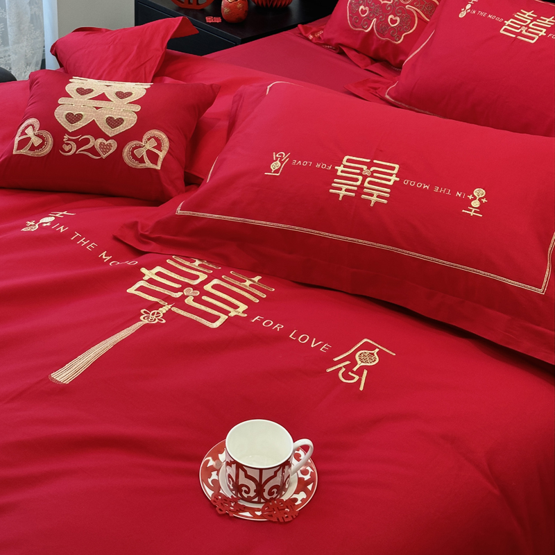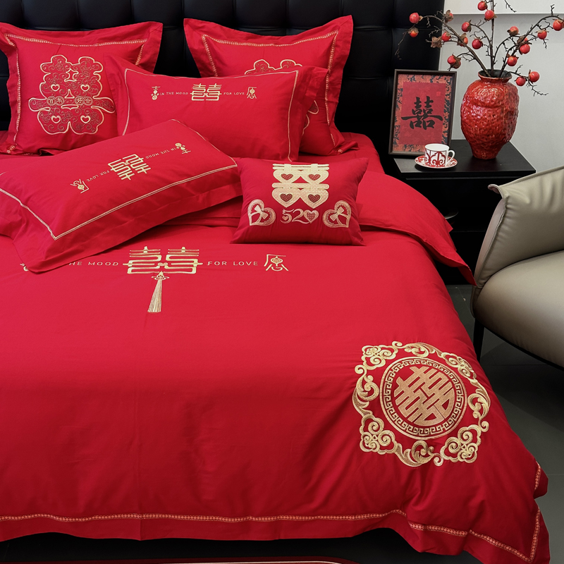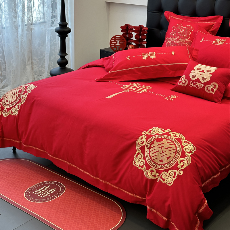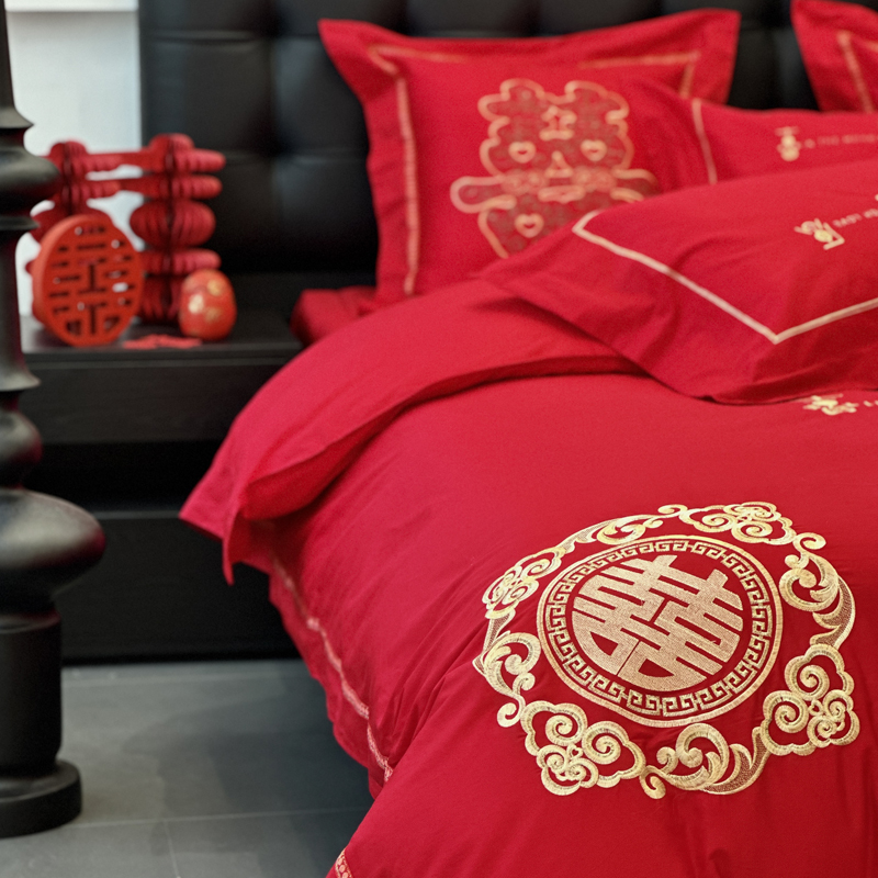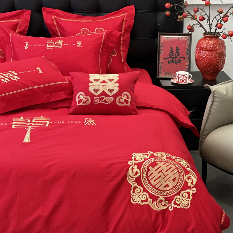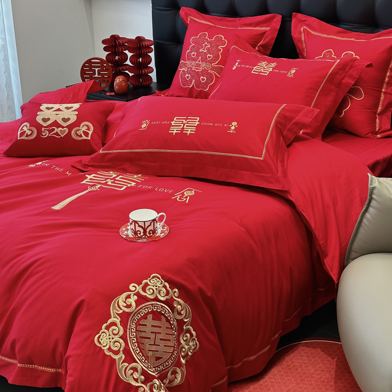 全棉大红刺绣婚庆套件-花嫁喜事