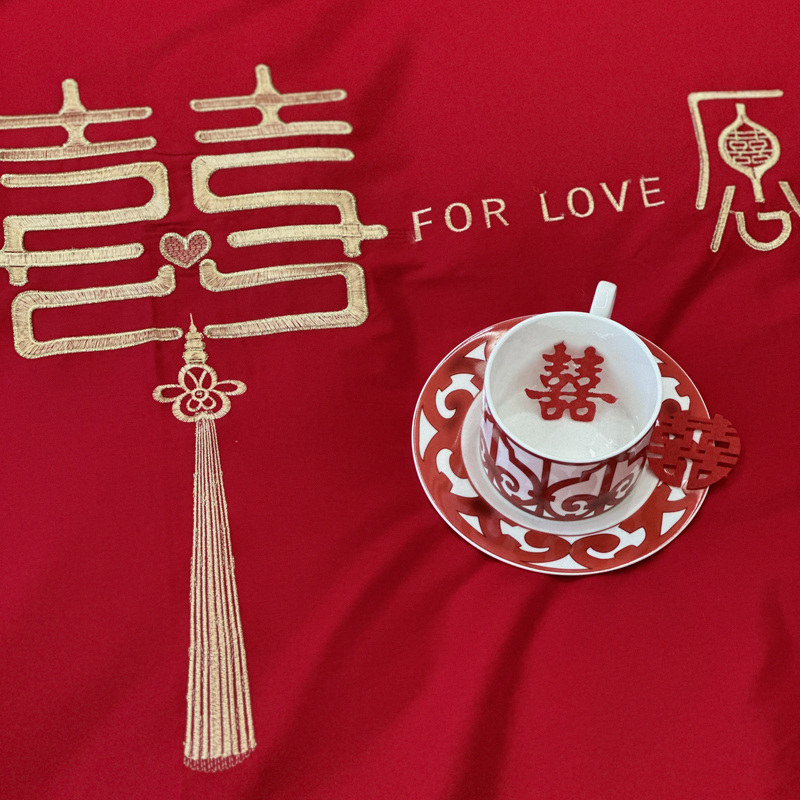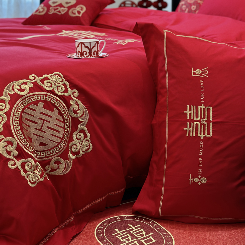 一针一线绣良辰,新中式国风婚床,盛启百年好合。以最炽热的中国红为底,承载千年婚禧的祝福。这套新中式婚庆床品套件,将传统吉祥图腾与现代审美意蕴完美交融,为您的洞房花烛夜铺陈一室雍容华贵与深情缱绻。中式刺绣风格,喜庆浪漫。幸福中国红,甜蜜浪漫,每一个细节都承载着设计师满满的祝福。宜言饮酒,与子偕老。琴瑟在御,莫不静好。