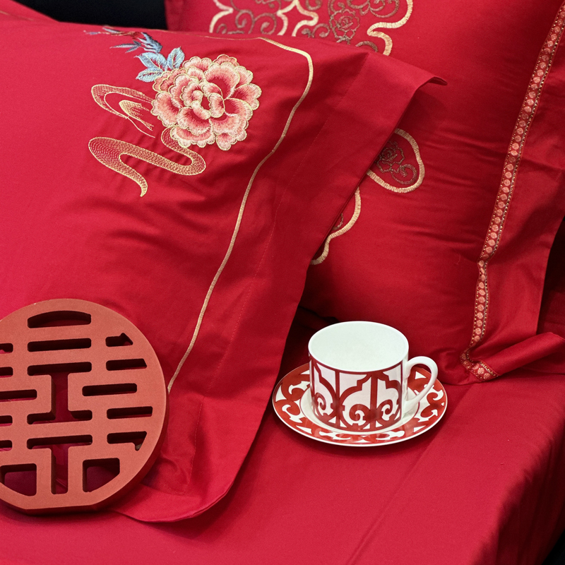 一针一线绣良辰,新中式国风婚床,盛启百年好合。以最炽热的中国红为底,承载千年婚禧的祝福。这套新中式婚庆床品套件,将传统吉祥图腾与现代审美意蕴完美交融,为您的洞房花烛夜铺陈一室雍容华贵与深情缱绻。中式刺绣风格,喜庆浪漫。幸福中国红,甜蜜浪漫,每一个细节都承载着设计师满满的祝福。宜言饮酒,与子偕老。琴瑟在御,莫不静好。